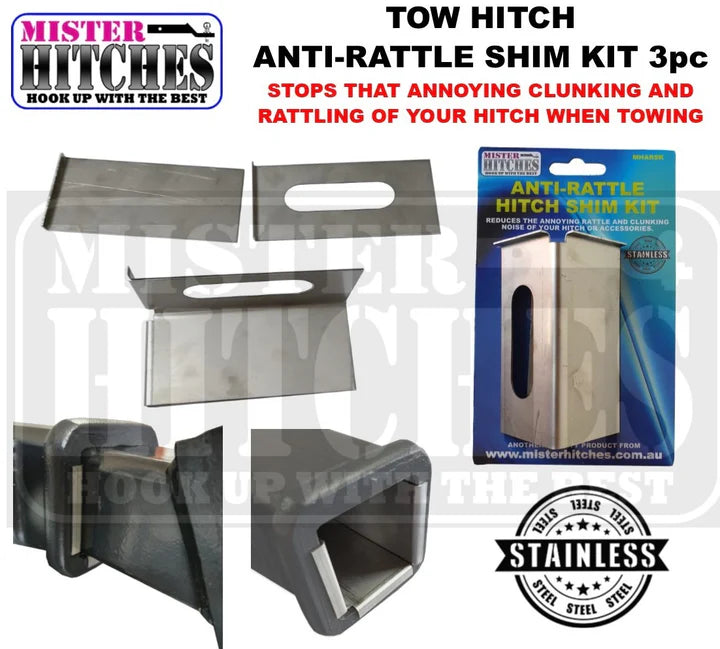 Eliminate hitch noise with the Mister Hitches Anti-Rattle Shim Kit. This set includes three stainless steel shimsâ1mm and 0.5mm optionsâfor reducing excessive play between the tow bar and tongue. Designed for both hollow and solid shanks, these shims are corrosion-resistant and easy to install. Perfect for maintaining a quiet, secure tow setup.