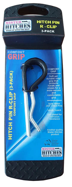 Ensure reliable towing with this 3-pack of Mister Hitches Soft Grip R-Clips. Zinc-plated for corrosion resistance, these clips feature a soft vinyl grip for comfortable use and secure fitment. Perfect for various caravan and trailer applications.