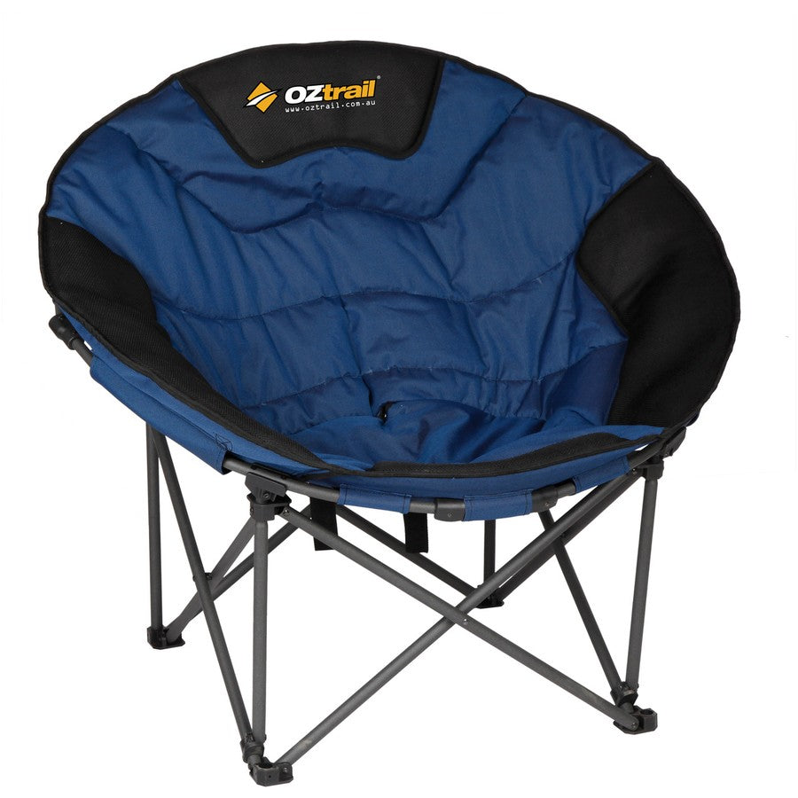 The OZtrail Moon Chair Jumbo is designed for ultimate relaxation with padded foam support and a built-in pillow. The chair features a sturdy 16mm high-tensile steel frame and folds up quickly to fit into a compact carry bag for easy transport.