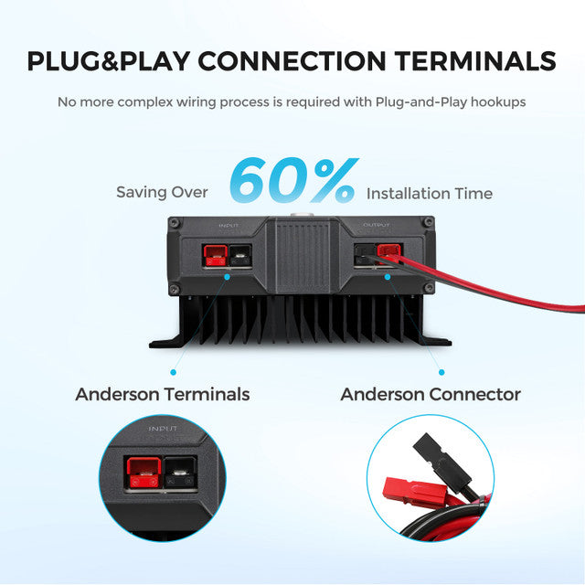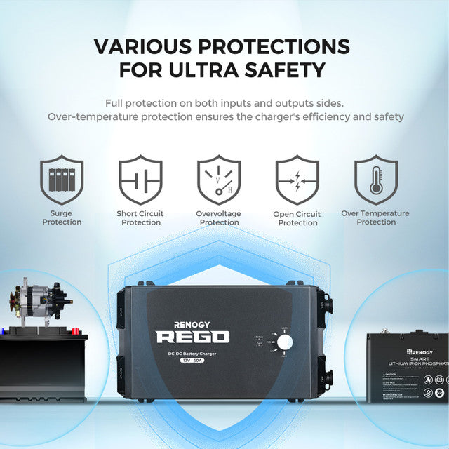The Renogy REGO 60A DC-DC Charger offers high-efficiency, 4-stage charging for lithium and lead-acid batteries. With bidirectional technology, it charges your house battery from your starter battery and vice versa. Easy to install with Anderson terminals and equipped with overvoltage, overtemperature, and reverse polarity protection. Ideal for RVs, boats, and off-grid setups.