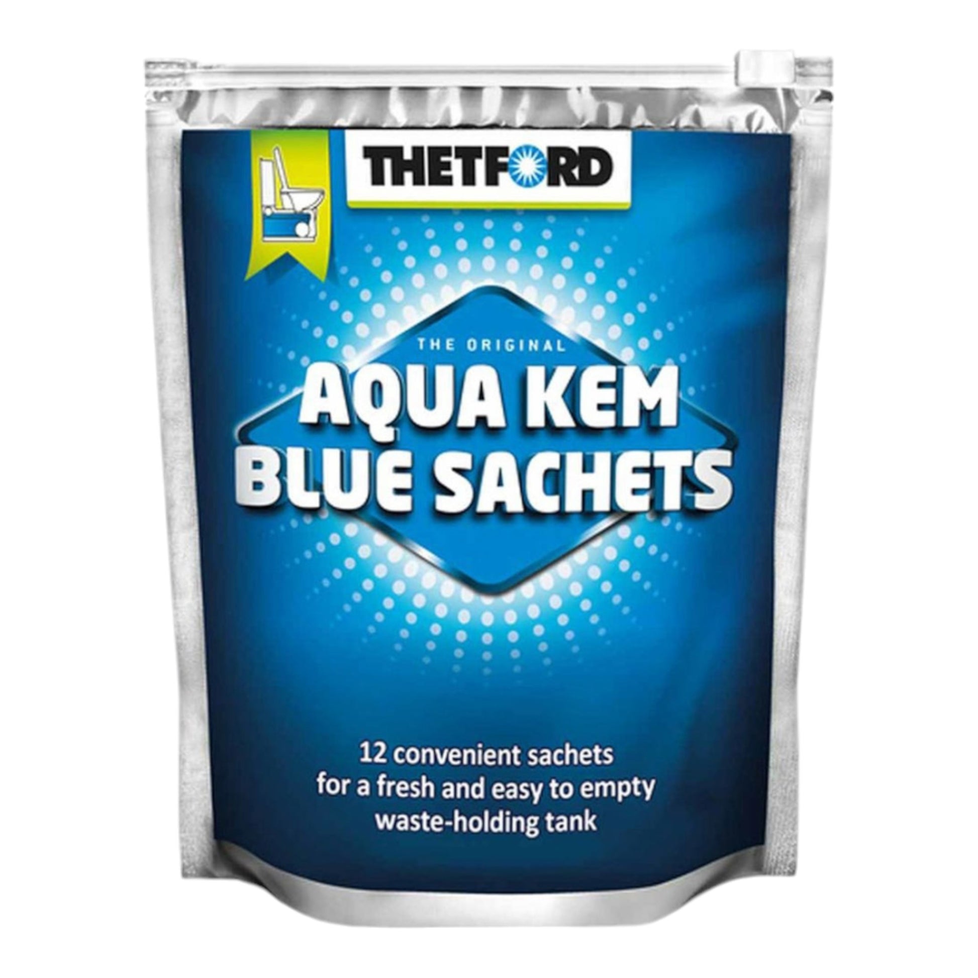 Thetford Aqua Kem Blue Sachets provide precise dosing for portable toilets, controlling odours, reducing gas build-up, and liquifying waste for easy disposal. Each dose lasts up to 5 days, and this pack includes 12 water-soluble sachets, making it convenient for camping trips